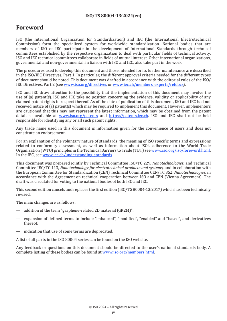 ISO/TS 80004-13:2024 is a Technical Specification in the ISO 80004 series on nanotechnologies that defines standardized vocabulary for graphene, graphene-related two‑dimensional (2D) materials (GR2M) and other 2D materials. The document clarifies terms for materials, production methods, properties and characterization to facilitate consistent communication across research, industry, regulation and standards development. The 2024 second edition introduces the term GR2M, expands performance/composition descriptors (e.g., “-enhanced”, “-enabled”, “-based”, “-modified”) and notes deprecated terms.