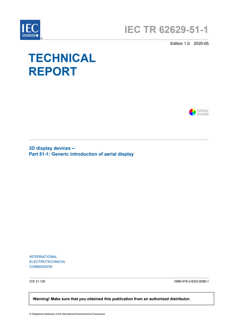 IEC TR 62629-51-1:2020 is a technical report published by the International Electrotechnical Commission (IEC). Its full title is "3D display devices - Part 51-1: Generic introduction of aerial display". This standard covers: IEC TR 62629-51-1:2020 (E), which is a Technical Report, provides general information for the standardization of aerial displays. This document includes an overview of the technology, critical performance characteristics, issues of optical measurements, and other information.