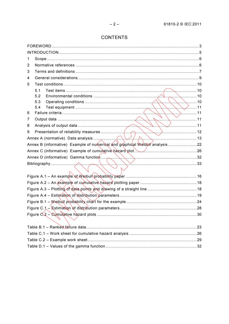 IEC 61810-2:2011 is a standard published by the International Electrotechnical Commission (IEC). Its full title is "Electromechanical elementary relays - Part 2: Reliability". This standard covers: IEC 61810-2:2011 covers test conditions and provisions for the evaluation of endurance tests using appropriate statistical methods to obtain reliability characteristics for relays. The main changes with respect to the previous edition are listed below: inclusion of both numerical and graphical methods for Weibull evaluation; establishment of full coherence with the second edition of the basic reliability standard IEC 61649. This publication is to be read in conjunction with IEC 61649:2008.