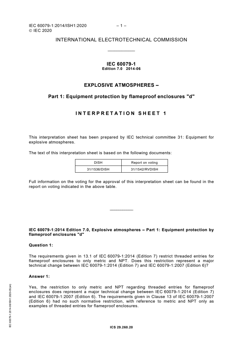 IEC 60079-1:2014/ISH1:2020 - Interpretation sheet 1 - Explosive atmospheres - Part 1: Equipment protection by flameproof enclosures "d" Released:5/28/2020