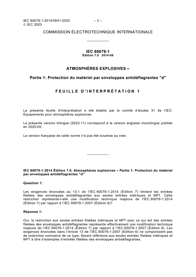 IEC 60079-1:2014/ISH1:2020 - Interpretation sheet 1 - Explosive atmospheres - Part 1: Equipment protection by flameproof enclosures "d"