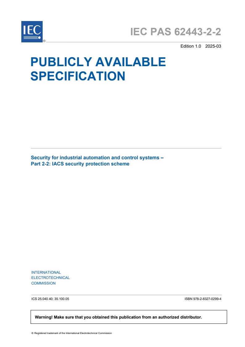 IEC PAS 62443-2-2:2025 is a technical specification published by the International Electrotechnical Commission (IEC). Its full title is "Security for industrial automation and control systems – Part 2-2: IACS security protection scheme". This standard covers: IEC PAS 62443-2-2: 2025 provides guidance on the development, validation, operation, and maintenance of a set of technical, physical, and process security measures called Security Protection Scheme (SPS). The document’s goal is to provide the asset owner implementing an IACS Security Program (SP) with mechanisms and procedures to ensure that the design, implementation and operation of an SPS manage the risks resulting from cyberthreats to each of the IACS included in its operating facility. The document is based on contents specified in other documents of the IEC 62443 series and explains how these contents can be used to support the development of technical, physical, and process security measures addressing the risks to the IACS during the operation phase.