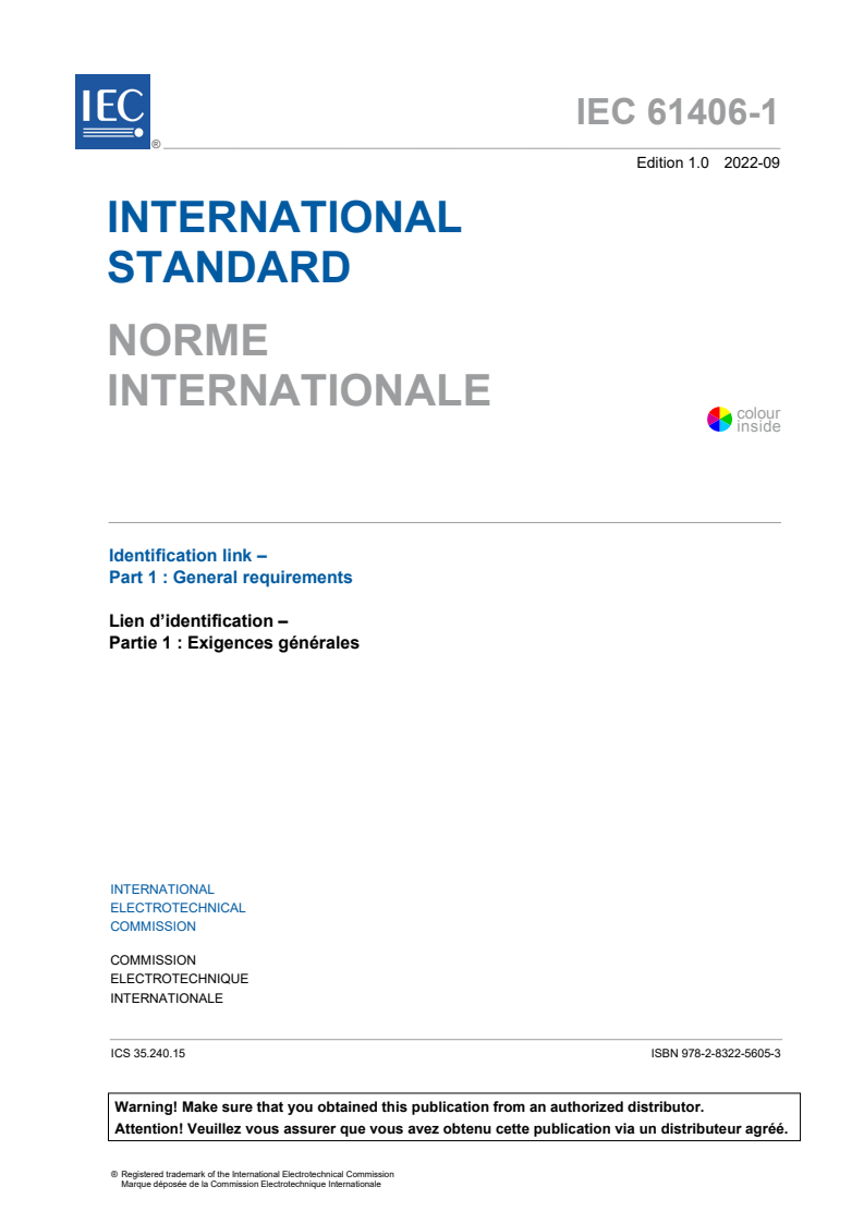 IEC 61406-1:2022 specifies minimum requirements for a globally unique identification of physical objects which also constitutes a link to its related digital information. This identification is designated hereinafter as "Identification Link" (IL), with the encoded data designated as IL string. The IL string has the data-format of a link (URL). The IL is machine-readable and is attached to the physical object in a 2D symbol or NFC tag. The requirements in this standard apply to physical objects: