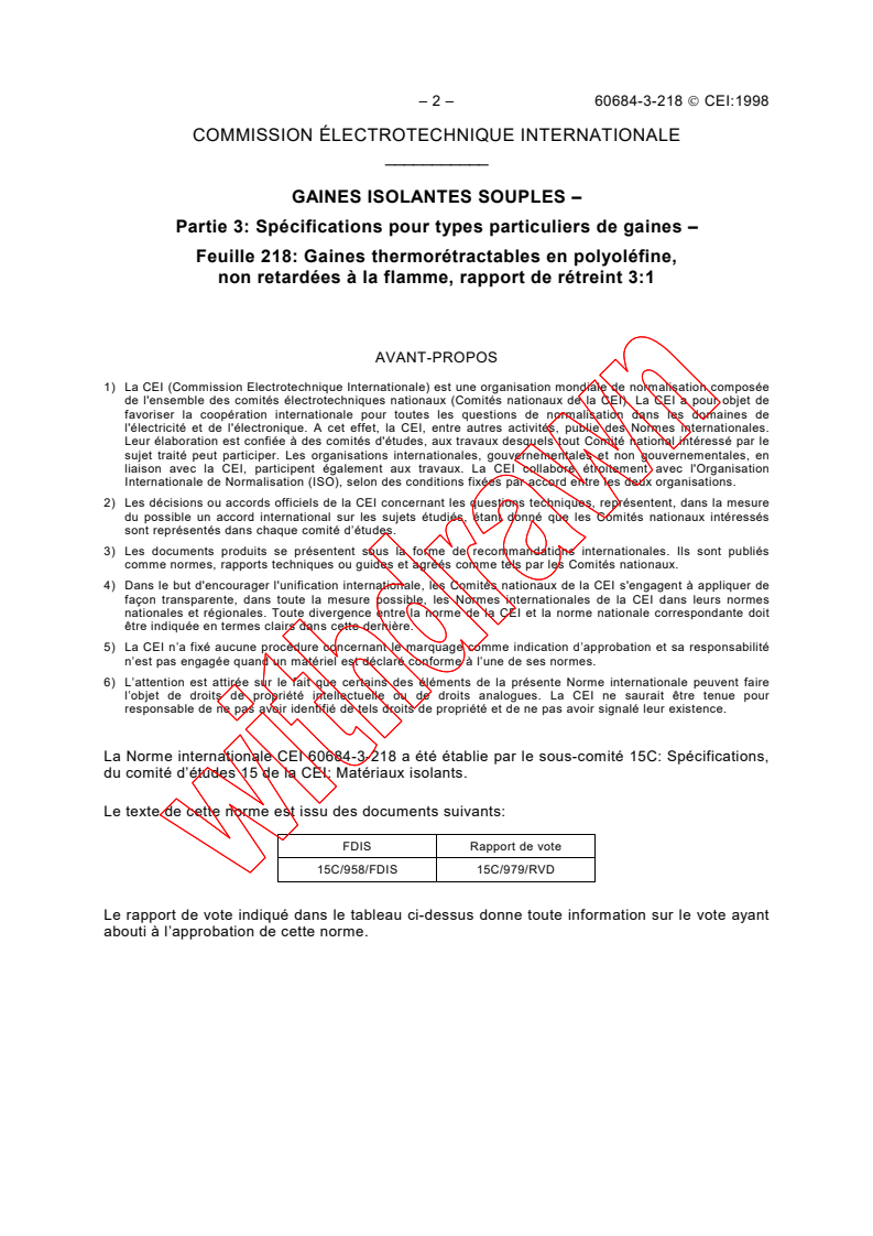 IEC 60684-3-218:1998 is a standard published by the International Electrotechnical Commission (IEC). Its full title is "Flexible insulating sleeving - Part 3: Specifications for individual types of sleeving - Sheet 218: Heat-shrinkable polyolefin sleeving, not flame retarded, shrink ratio 3:1". This standard covers: Gives the requirements for one type of heat-shrinkable polyolefin sleeving with a temperature index of 135 and a nominal shrink ratio of 3:1. This sleeving is not flame retarded. It is normally supplied with internal diameter up to 39 mm and the standard colour is transparent.