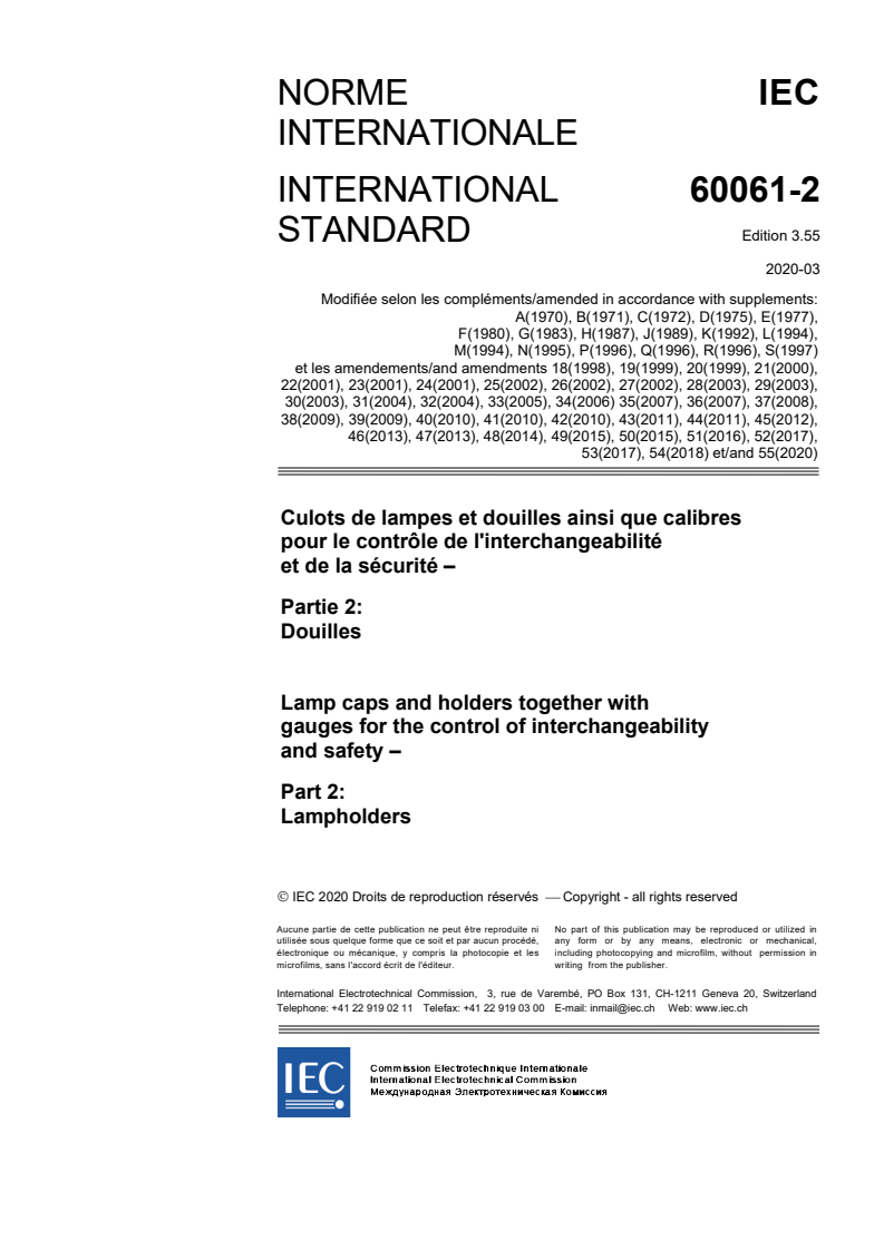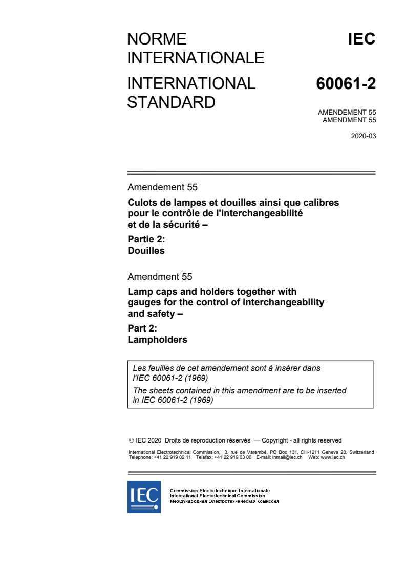 IEC 60061-2:1969/AMD55:2020 is an important amendment to the international standard governing lamp caps and holders, specifically focusing on Part 2: Lampholders. Published by the International Electrotechnical Commission (IEC), this amendment updates the original 1969 standard to ensure continued control of interchangeability and safety of lamp holders used globally. Lampholders are essential components in lighting equipment, securing the lamp and providing electrical connection, and this standard provides detailed specifications to guarantee compatibility and reliable performance.