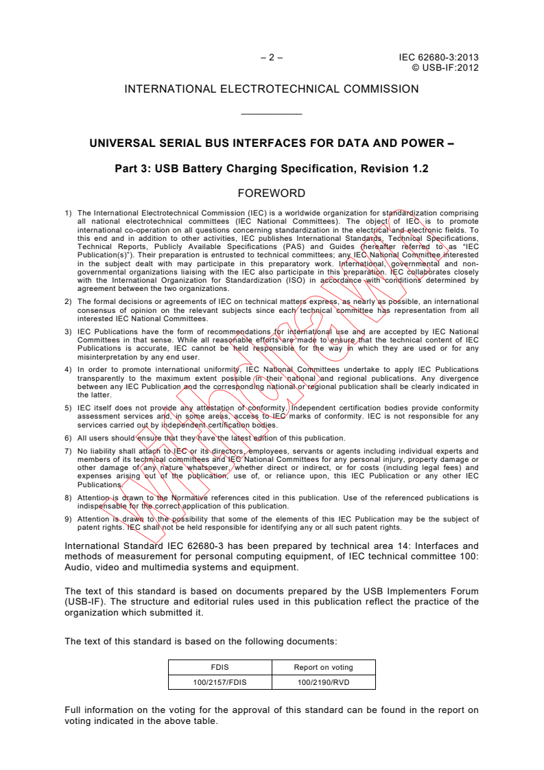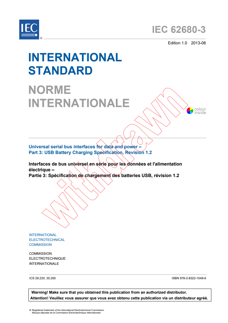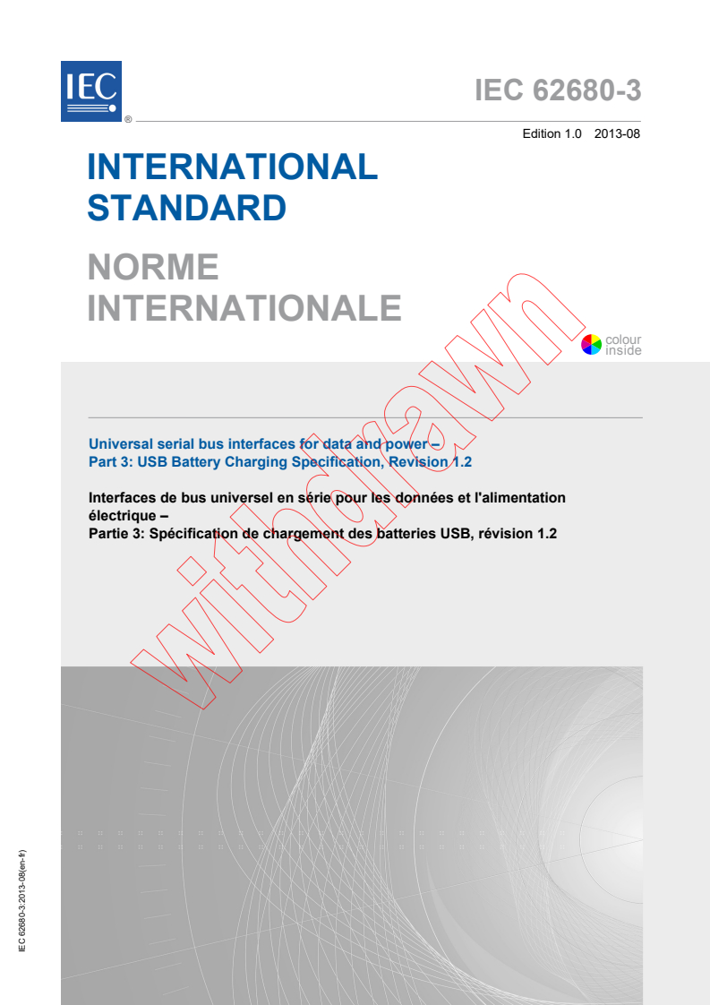 IEC 62680-3:2013 is a standard published by the International Electrotechnical Commission (IEC). Its full title is "Universal serial bus interfaces for data and power - Part 3: USB Battery Charging Specification, Revision 1.2". This standard covers: IEC 62680-3:2013 contains the specifications that define limits as well as detection, control and reporting mechanisms to permit devices to draw current in excess of the USB 2.0 specification for charging and/or powering up from dedicated chargers, hosts, hubs and charging downstream ports. These mechanisms are backward compatible with USB 2.0 compliant hosts and peripherals. The text is based on documents prepared by the USB Implementers Forum (USB-IF). The structure and editorial rules used in this publication reflect the practice of the organization which submitted it.