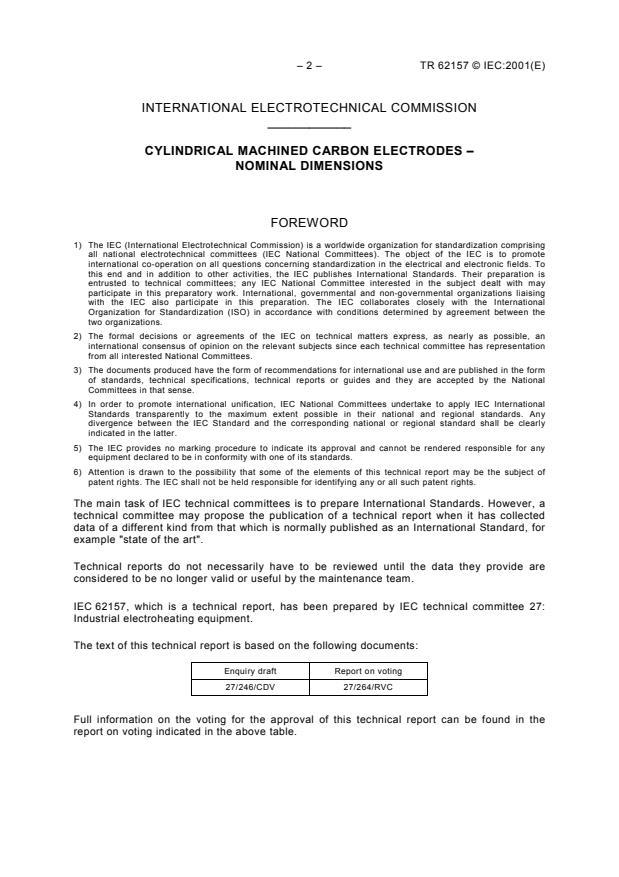 IEC TR 62157:2001 is a technical report published by the International Electrotechnical Commission (IEC) that standardizes the nominal dimensions of cylindrical machined carbon electrodes. These electrodes are primarily manufactured from upgraded coal and designed for use in electric direct-arc and submerged-arc furnaces. Applications include melting silicium and carbide, among other industrial processes.