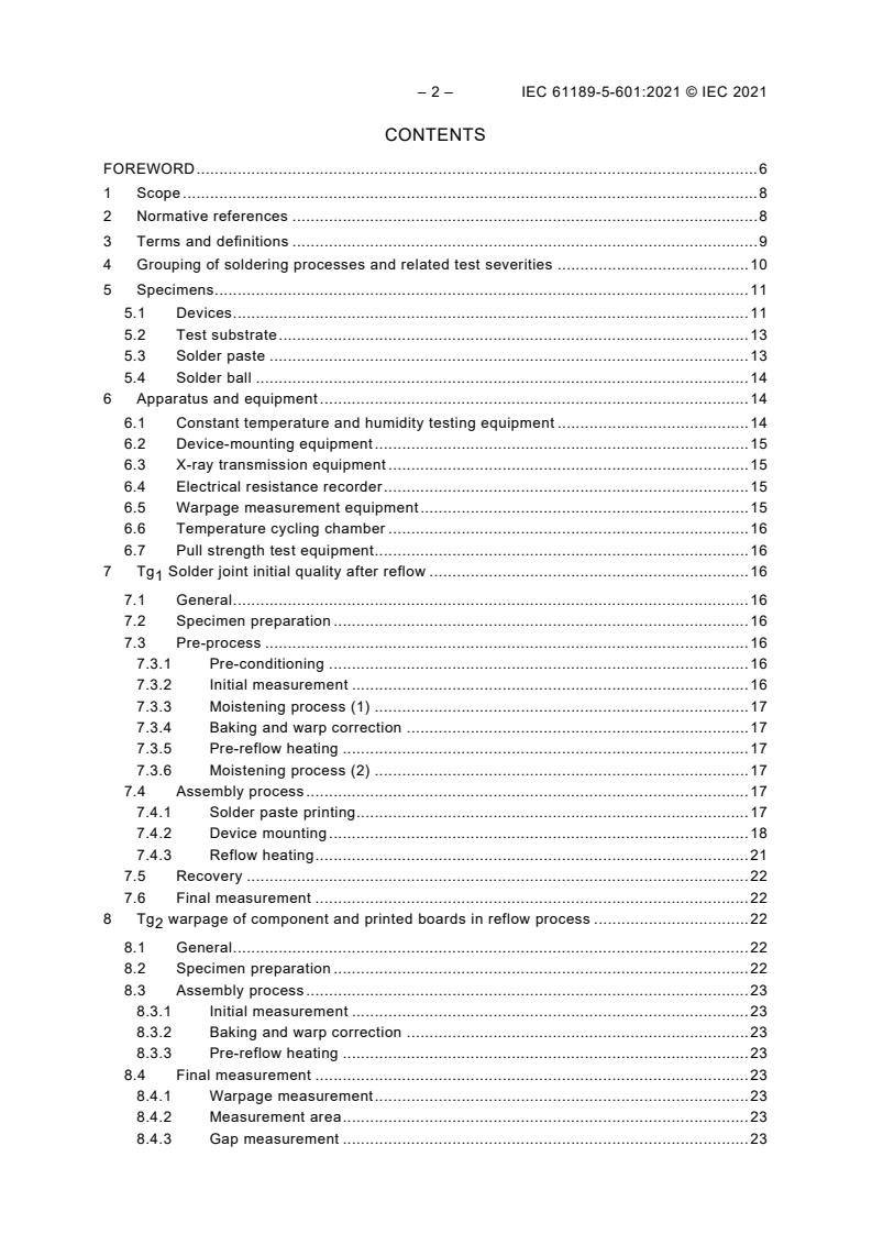 IEC 61189-5-601:2021 specifies the reflow soldering ability test method for components mounted on organic rigid printed boards, the reflow heat resistance test method for organic rigid printed boards, and the reflow soldering ability test method for the lands of organic rigid printed boards in applications using solder alloys, which are eutectic or near-eutectic tin-lead (Pb), or lead-free alloys.