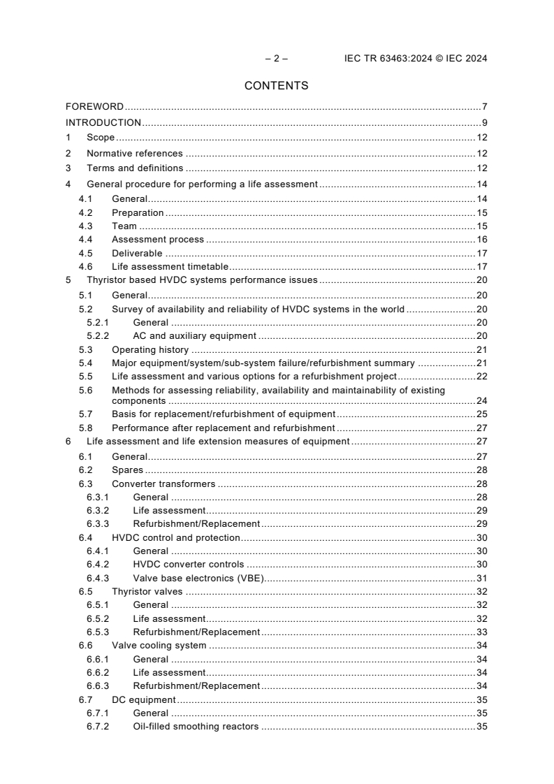 IEC TR 63463:2024 provides guidelines for the general procedure for performing life assessment for an HVDC converter station. Following this, a more detailed description of performance issues of the thyristor based HVDC systems is given and the life assessment measures of equipment and guidelines for accessing the techno-economic life of equipment are given. This document also deals with information for specification of refurbishing HVDC system and the testing of the refurbished and replaced equipment. Lastly, this document outlines environmental issues and regulatory issues involved in the life assessment and concludes with a financial analysis of the refurbishment options.