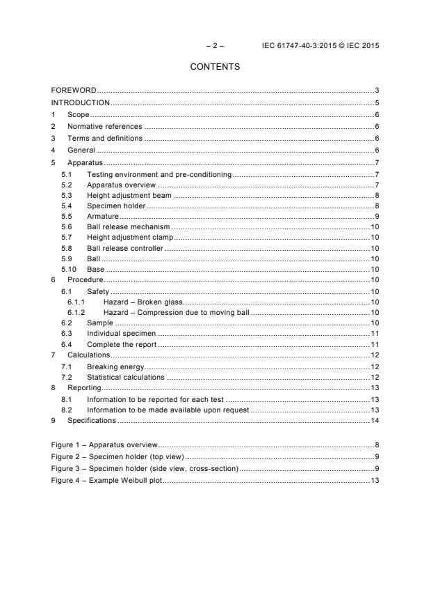 IEC 61747-40-3:2015 defines a mechanical performance test for display cover glass used in mobile electronic devices, measuring surface impact resistance by a ball drop method that induces biaxial flexure. The procedure is statistical: a series of specimens from a sample are impacted by a dropping ball and the biaxial flexural energy to failure (breaking energy) is recorded and analyzed to characterize strength and reliability.