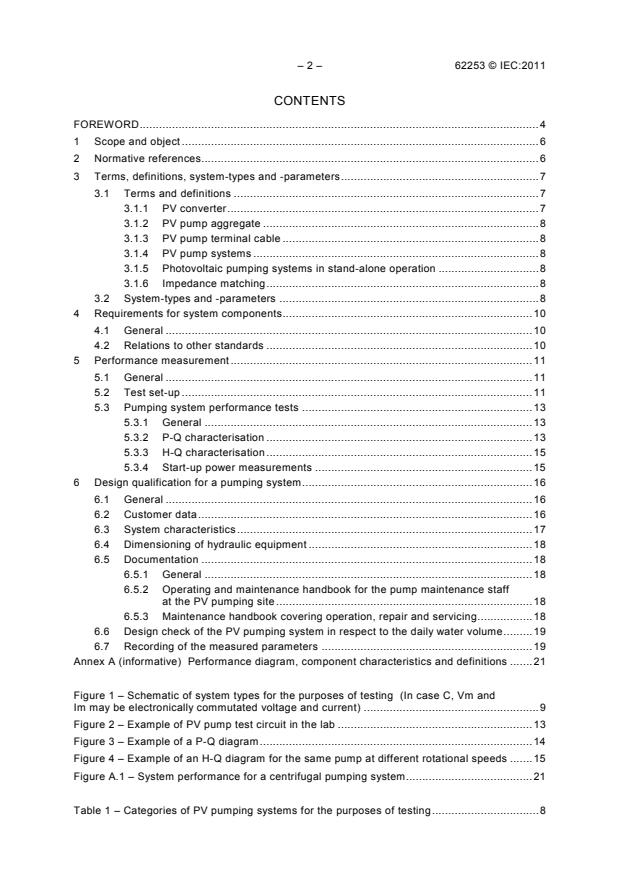 IEC 62253:2011 is a standard published by the International Electrotechnical Commission (IEC). Its full title is "Photovoltaic pumping systems - Design qualification and performance measurements". This standard covers: IEC 62253:2011 defines the requirements for design, qualification and performance measurements of photovoltaic (PV) pumping systems in stand-alone operation. The outlined measurements are applicable for either indoor tests with PV generator simulator or outdoor tests using a real PV generator. This standard applies to systems with motor pump sets connected to the PV generator directly or via a converter (DC to DC or DC to AC).