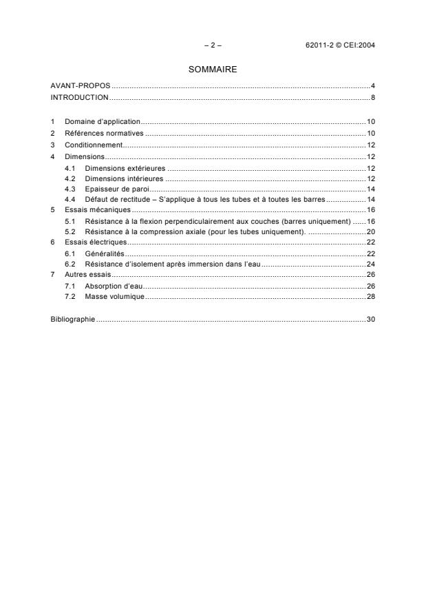 IEC 62011-2:2004 is a standard published by the International Electrotechnical Commission (IEC). Its full title is "Insulating materials - Industrial, rigid, moulded, laminated tubes and rods of rectangular and hexagonal cross-section, based on thermosetting resins for electrical purposes - Part 2: Methods of test". This standard covers: Deals with the test methods for industrial, rigid, moulded, laminated tubes and rods of rectangular and hexagonal cross-section, based on thermosetting resins for electrical purposes. The test methods include the following: a) Dimensions - External dimensions - Internal dimensions - Wall thickness - Departure from straightness - Applicable to all tubes and rods b) Mechanical tests - Flexural strength perpendicular to laminations (rods only) - Axial compressive strength (tubes only) c) Electrical tests - General - Insulation resistance after immersion in water d) Other tests - Water absorption - Density