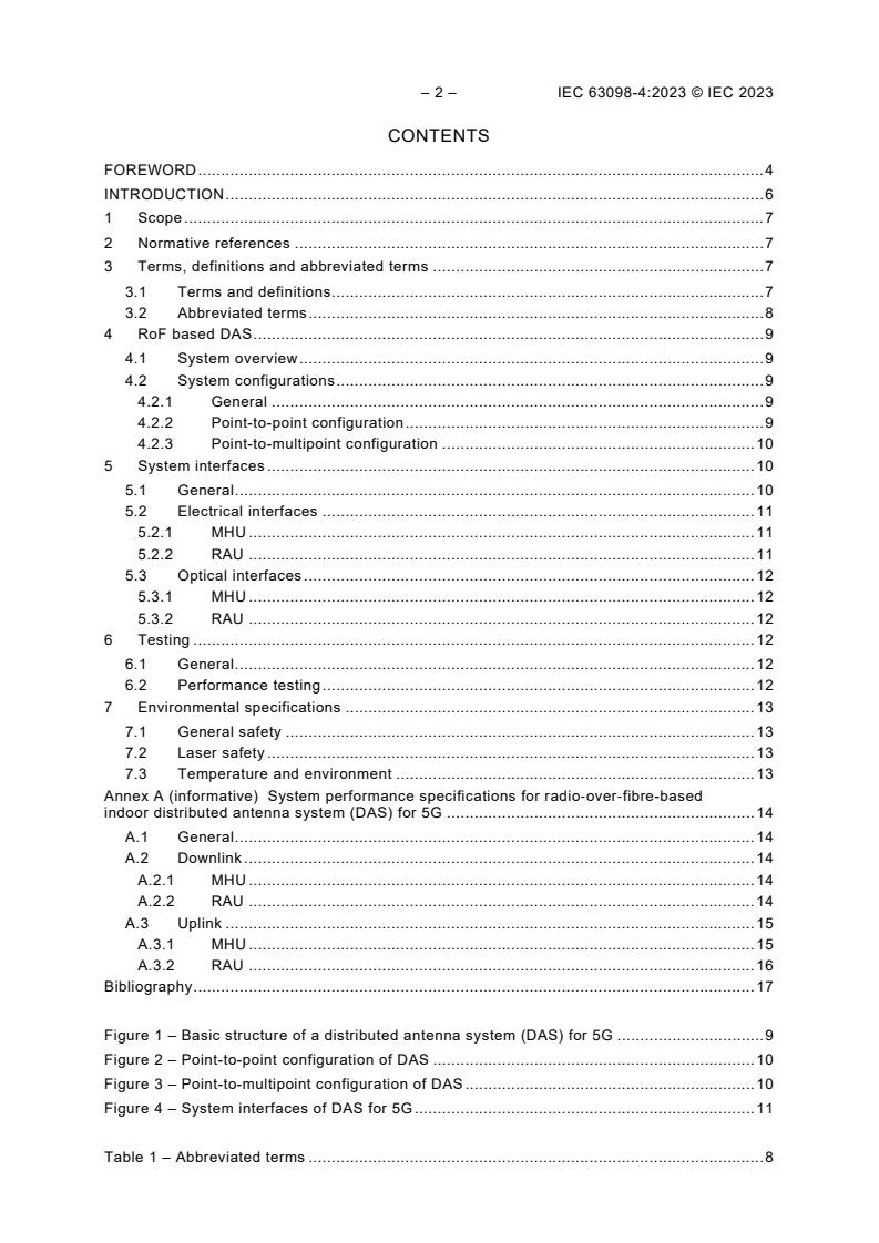 Keywords: IEC 63098‑4:2023, Radio‑over‑fibre, RoF‑based DAS, 5G indoor DAS, MHU, RAU, QoS, low latency, high bandwidth, point‑to‑multipoint.