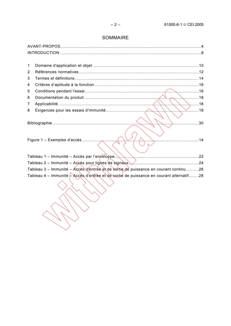 S'applique aux appareils électriques et électroniques destinés à être utilisés dans des environnements résidentiels, commerciaux et de l'industrie légère. Cette partie couvre les exigences d'immunité dans la gamme de fréquences de 0 Hz à 400 GHz. Il n'est pas nécessaire de réaliser des essais aux fréquences pour lesquelles aucune exigence n'est spécifiée. Cette norme générique d'immunité CEM s'applique en l'absence de norme d'immunité CEM applicable, spécifique à un produit ou à une famille de produits. Cette norme s'applique aux appareils destinés à être raccordés directement au réseau public d'alimentation basse tension ou à une source de courant continu spécifique destinée à servir d'interface entre l'appareil et le réseau public d'alimentation basse tension. Cette norme s'applique également aux appareils alimentés par piles ou batteries ou par un système de distribution basse tension non public, mais non industriel, lorsque cet appareil est destiné à être utilisé dans les emplacements décrits ci-dessous. Les environnements couverts par cette norme sont les sites résidentiels, les locaux commerciaux et de l'industrie légère, à la fois intérieurs et extérieurs. La liste suivante, bien que non exhaustive, donne une indication sur les sites qui sont couverts: - propriétés résidentielles, par exemple maisons, appartements; - lieux de vente au détail, par exemple boutiques, supermarchés; - centres d'affaires, par exemple bureaux, banques; - locaux de loisirs recevant du public, par exemple cinémas, bars, dancings; - sites extérieurs, par exemple stations service, parcs de stationnement, centres de loisirs et centres sportifs; - locaux de l'industrie légère, par exemple ateliers, laboratoires, centres de services. Les sites qui sont caractérisés comme étant alimentés directement en basse tension par le réseau public sont considérés comme résidentiels, commerciaux ou pour l'industrie légère. Les exigences d'immunité ont été choisies pour assurer un niveau adéquat d'immunité pour les appareils utilisés sur des sites résidentiels, commerciaux et de l'industrie légère. Ces niveaux ne couvrent pas cependant les cas extrêmes qui peuvent apparaître, mais avec une très faible probabilité, sur un site quelconque. Cette norme ne comporte pas, pour les besoins des essais, tous les phénomènes perturbateurs mais uniquement ceux qui sont considérés comme applicables aux appareils couverts par la norme. Ces exigences d'essais représentent les exigences essentielles de compatibilité électromagnétique concernant l'immunité. Les exigences sont spécifiées pour chaque accès considéré.