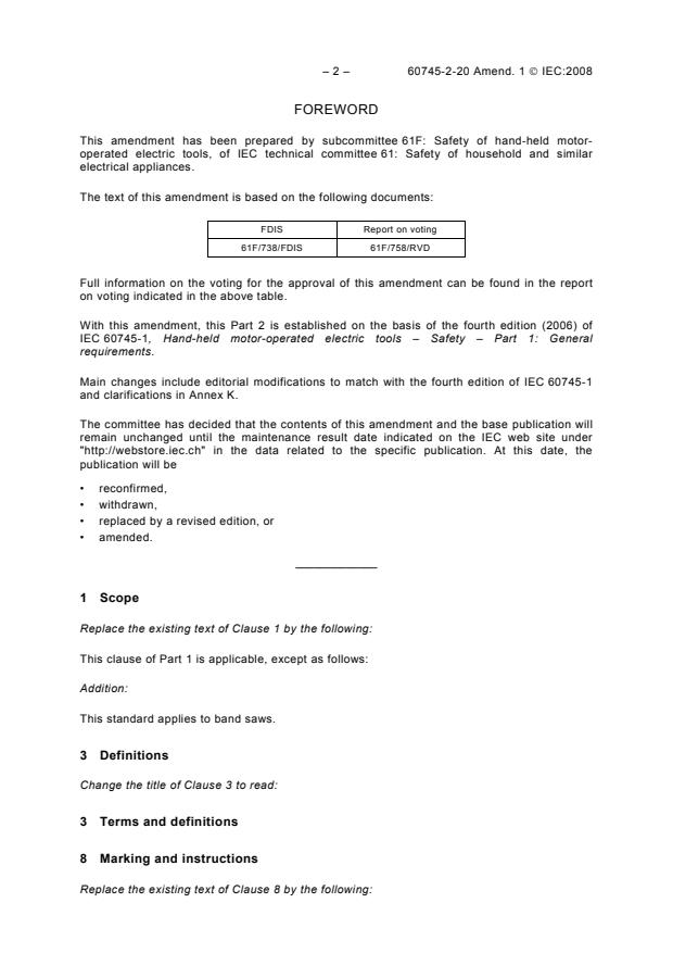 IEC 60745-2-20:2003/AMD1:2008 is a standard published by the International Electrotechnical Commission (IEC). Its full title is "Amendment 1 - Hand-held motor-operated electric tools - Safety - Part 2-20: Particular requirements for band saws". This standard covers: Amendment 1 - Hand-held motor-operated electric tools - Safety - Part 2-20: Particular requirements for band saws