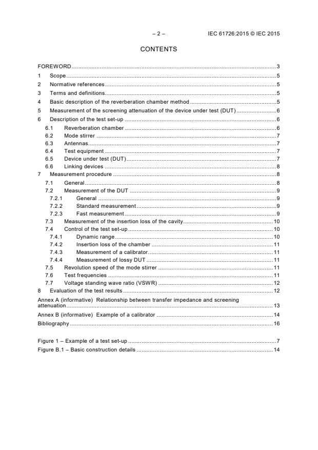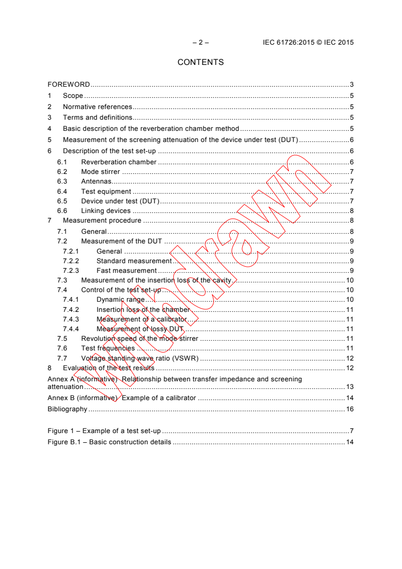 IEC 61726:2015 is a standard published by the International Electrotechnical Commission (IEC). Its full title is "Cable assemblies, cables, connectors and passive microwave components - Screening attenuation measurement by the reverberation chamber method". This standard covers: IEC 61726:2015 describes the measurement of screening attenuation by the reverberation chamber test method, sometimes named mode stirred chamber, suitable for virtually any type of microwave component and having no theoretical upper frequency limit. It is only limited toward low frequencies due to the size of the test equipment, which is frequency-dependent and is only one of several methods of measuring screening attenuation. For the purpose of this standard, examples of microwave components are waveguides, phase shifters, diplexers/multiplexers, power dividers/combiners etc. This third edition cancels and replaces the second edition, published in 1999. This edition constitutes a technical revision. It takes into account the latest developments in the design of reverberation chambers as described in IEC 61000-4-21, which is also referencing this standard as a possible test method. Furthermore, an alternative measurement procedure is added which is able to reduce the measurement time needed.
