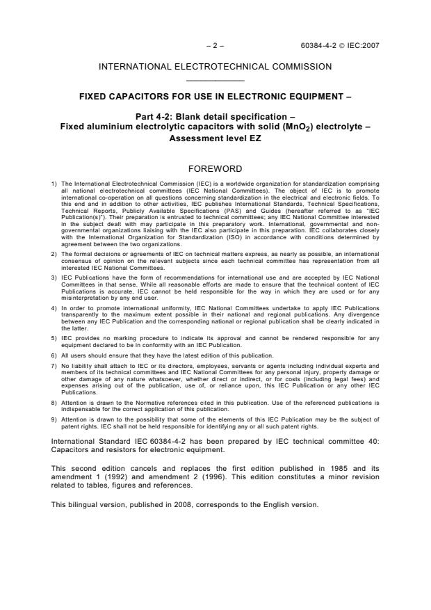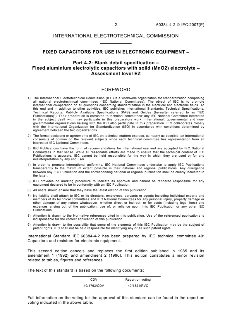 IEC 60384-4-2:2007 is a standard published by the International Electrotechnical Commission (IEC). Its full title is "Fixed capacitors for use in electronic equipment - Part 4-2: Blank detail specification - Fixed aluminium electrolytic capacitors with solid (MnO<sub>2</sub>) electrolyte - Assessment level EZ". This standard covers: IEC 60384-4-2:2007 is a blank detail specification and is a supplementary document to the sectional specification and contains requirements for style and layout and minimum content of detail specifications. Detail specifications not complying with these requirements may not be considered as being in accordance with IEC specifications nor shall they be so described. This second edition cancels and replaces the first edition published in 1985 and its amendment 1 (1992) and amendment 2 (1996). This edition constitutes a minor revision related to tables, figures and references. This bilingual version, published in 2008, corresponds to the English version.
