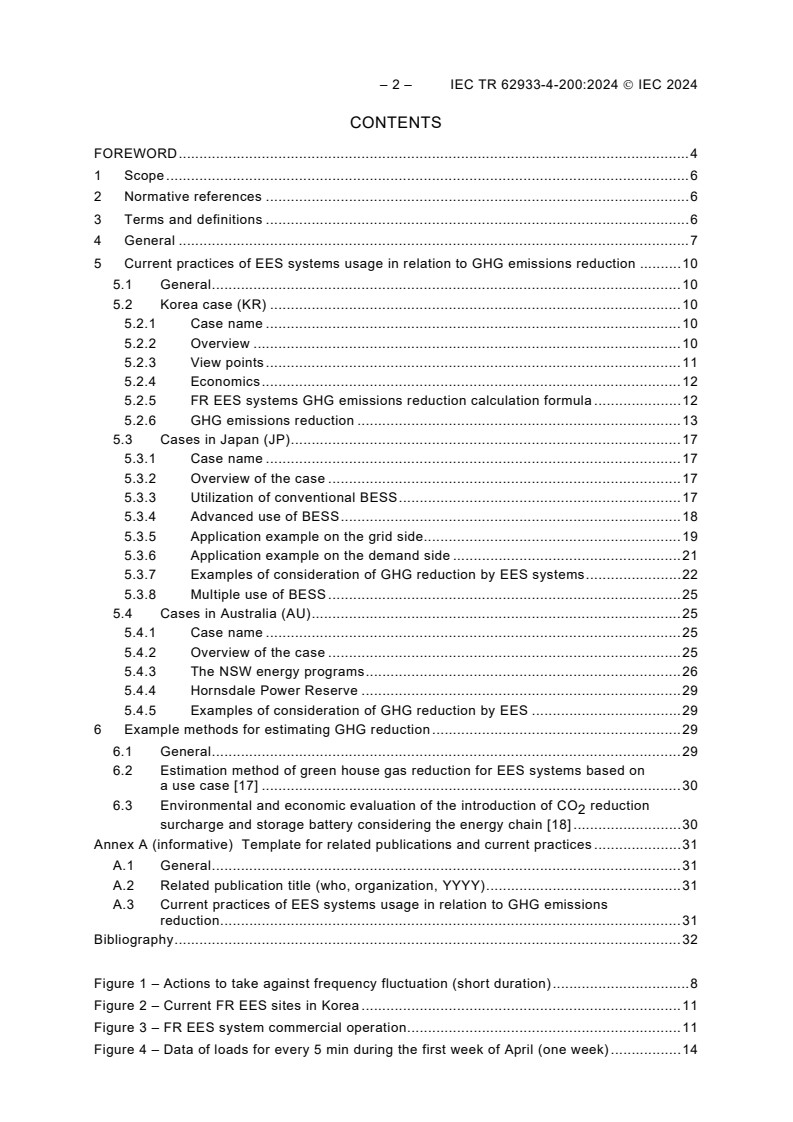 IEC TR 62933-4-200:2024 describes aspects on reduction of greenhouse gas (GHG) emissions associated with electrical energy storage systems (EES systems), and presents current practices, research activities and related researches in each country.