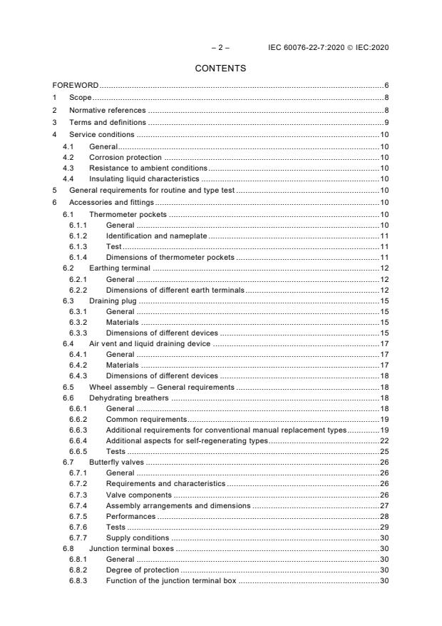 IEC 60076-22-7:2020 applies to a selection of accessories and fittings mounted on liquid immersed power transformers according to IEC 60076-1 and reactors according to IEC 600766 with or without conservator for indoor or outdoor installation. It outlines the service conditions and the mechanical requirements that are common to all the accessories and fittings. This document also outlines the operation requirements specific to each device as well as the preferred dimensions relevant for interchangeability and the type and routine test to be performed.This document covers an exhaustive selection of the accessories and fittings that are currently used on transformers or reactors.