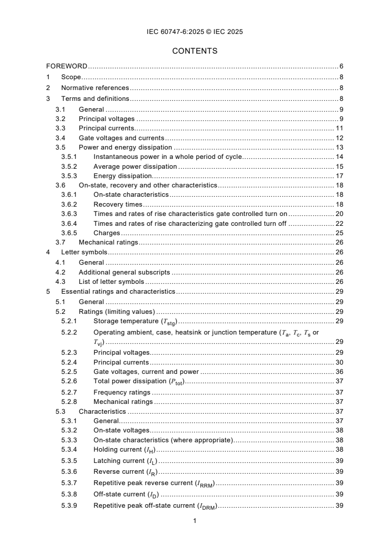 IEC 60747-6:2025 specifies product specific standards for terminology, letter symbols, essential ratings and characteristics (properties), measuring and test methods, requirements for type tests, routine tests, endurance tests and marking for the following discrete semiconductor devices: - reverse blocking triode thyristors; - reverse conducting (triode) thyristors; - bidirectional triode thyristors (triacs); - turn-off thyristors. If no ambiguity is likely to result, any of the above will be referred to as thyristors. This edition includes the following significant technical changes with respect to the previous edition: a) the terms and definitions for partial thermal resistance junction-to-case and voltages related to ratings and characteristics (properties) have been added; b) Clauses 3, 4, 5, 6 and 7 were amended with some deletions of information no longer in use and with some necessary additions.