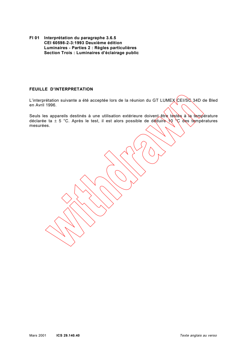 Keywords: IEC 60598-2-3, luminaires standard, road lighting requirements, street lighting luminaires, electrical safety, outdoor lighting standards, luminous fixtures, endurance testing, dust and moisture resistance, IEC standards for luminaires, public lighting compliance.