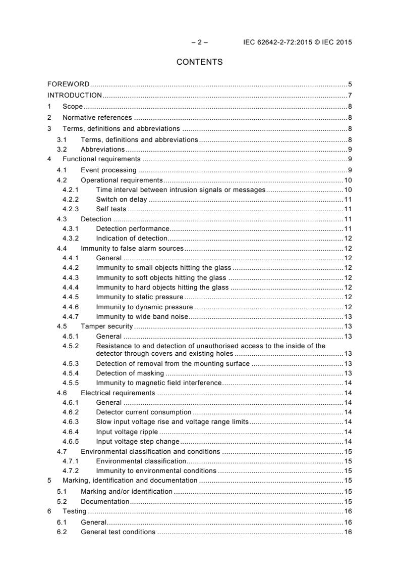 IEC 62642-2-72:2015 defines passive surface mounted glass break detectors installed in buildings and provides for security grades 1 to 4 (see IEC 62642-1), specific or non-specific wired or wire-free detectors, and uses environmental classes I to IV (see IEC 62599-1).