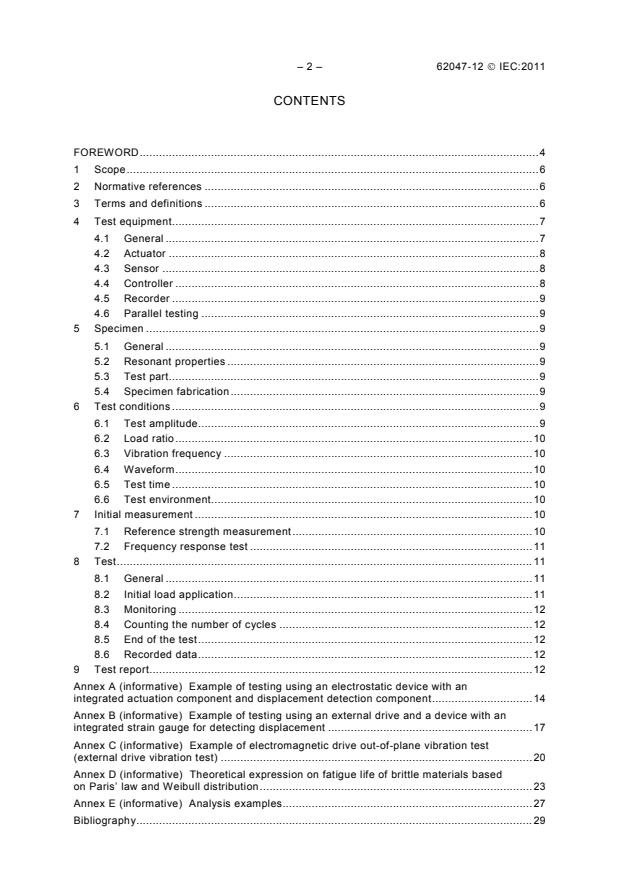 IEC 62047-12:2011 specifies a method for bending fatigue testing using resonant vibration of microscale mechanical structures of MEMS (micro-electromechanical systems) and micromachines. This standard applies to vibrating structures ranging in size from 10 μm to 1 000 μm in the plane direction and from 1 μm to 100 μm in thickness, and test materials measuring under 1 mm in length, under 1 mm in width, and between 0,1 μm and 10 μm in thickness. The main structural materials for MEMS, micromachine, etc. have special features, such as typical dimensions of a few microns, material fabrication by deposition, and test piece fabrication by means of non-mechanical machining, including photolithography. The MEMS structures often have higher fundamental resonant frequency and higher strength than macro structures. To evaluate and assure the lifetime of MEMS structures, a fatigue testing method with ultra high cycles (up to 1012) loadings needs to be established. The object of the test method is to evaluate the mechanical fatigue properties of microscale materials in a short time by applying high load and high cyclic frequency bending stress using resonant vibration.