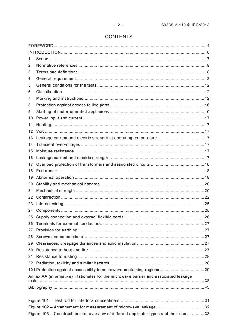 IEC 60335-2-110:2013 is a standard published by the International Electrotechnical Commission (IEC). Its full title is "Household and similar electrical appliances - Safety - Part 2-110: Particular requirements for commercial microwave appliances with insertion or contacting applicators". This standard covers: IEC 60335-2-110:2013 deals with the safety of microwave appliances intended for commercial use, their rated voltage being not more than 250 V for single-phase appliances connected between one phase and neutral and 480 V for other appliances. Appliances covered by this standard incorporate an open-ended applicator (as example an overview is given in Figure 103) for treatment of the load. They are divided into three types: - with insertion applicator, typically for moisture removal by insertion into holes in floors, walls or ceilings (an example is given in Figure 106); - with large area contacting applicator, typically for drying of floors, walls or ceilings (examples are given in Figure 104 and Figure 105); - with small area contacting applicator, typically for paint removal and spot-heating (an example is given in Figure 107). Key words: commercial microwave appliance, insertion applicator, contacting applicator This publication is to be read in conjunction with IEC 60335-1:2010.