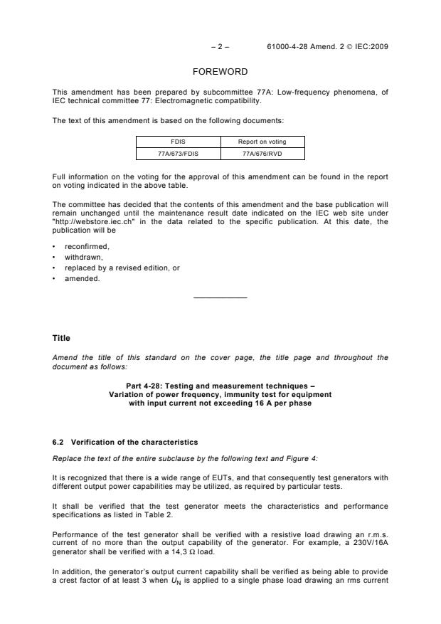 Amendment 2 - Electromagnetic compatibility (EMC) - Part 4-28: Testing and measurement techniques - Variation of power frequency, immunity test for equipment with input current not exceeding 16 A per phase