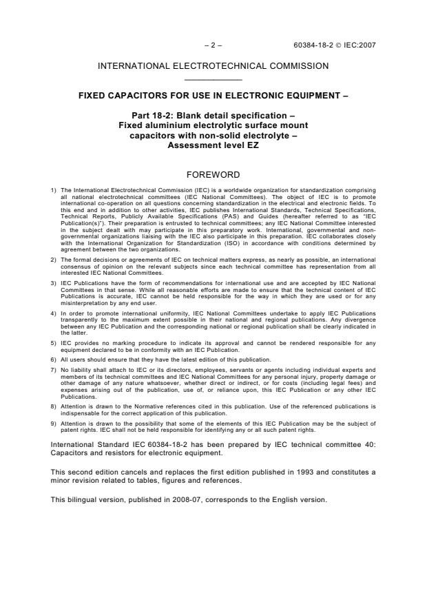 IEC 60384-18-2:2007 is a blank detail specification from the IEC 60384 series. It is a template and supplementary document to the sectional specification IEC 60384-18 that defines the required style, layout and minimum content for detail specifications covering fixed aluminium electrolytic surface mount capacitors with non‑solid electrolyte (Assessment level EZ). The second edition (2007) replaces the 1993 edition and makes minor editorial revisions to tables, figures and references. Detail specifications that do not follow this blank template may not be considered compliant with IEC requirements.