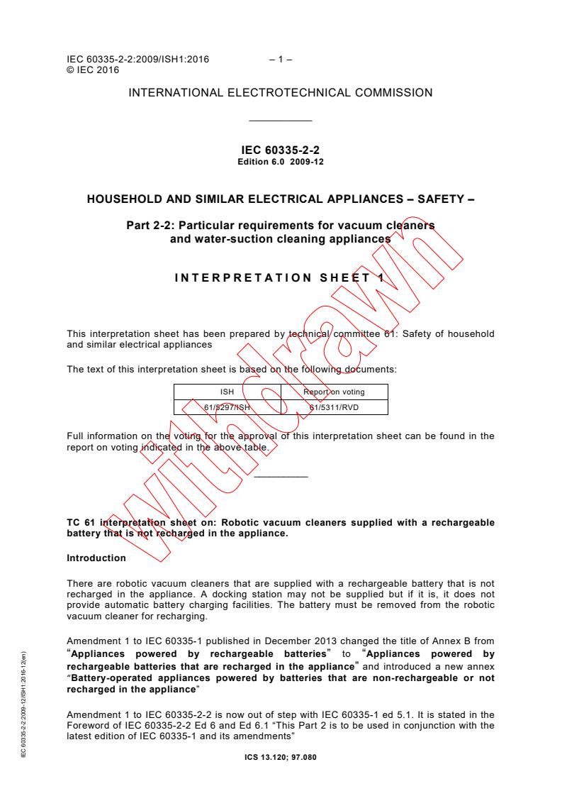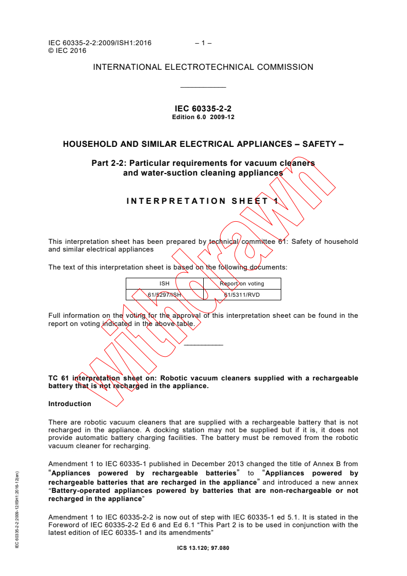IEC 60335-2-2:2009 is a standard published by the International Electrotechnical Commission (IEC). Its full title is "Household and similar electrical appliances - Safety - Part 2-2: Particular requirements for vacuum cleaners and water-suction cleaning appliances". This standard covers: IEC 60335-2-2:2009 deals with the safety of electric vacuum cleaners and water-suction cleaning appliances for household and similar purposes, including vacuum cleaners for animal grooming, their rated voltage being not more than 250 V. It also applies to centrally-sited vacuum cleaners and automatic battery-powered cleaners. This standard also applies to motorized cleaning heads and current-carrying hoses associated with a particular vacuum cleaner. The principal changes in this edition as compared with the fifth edition of IEC 60335-2-2 is as follows: The text is aligned with IEC 60335-1:2001, and its amendments 1 and 2. The attention of the National Committees is drawn to the fact that equipment manufacturers and testing organizations may need a transitional period following publication of a new, amended or revised IEC publication in which to make products in accordance with the new requirements and to equip thenselves for conducting new or revised tests. It is the recommendation of the committee that the content of this publication be adopted for implementation nationally not earlier than 12 months or later than 36 months from the date of publication. Key words: Cleaning appliances, water-suction, vacuum. The contents of the corrigendum of December 2016 have been included in this copy. This publication is to be read in conjunction with IEC 60335-1:2010.