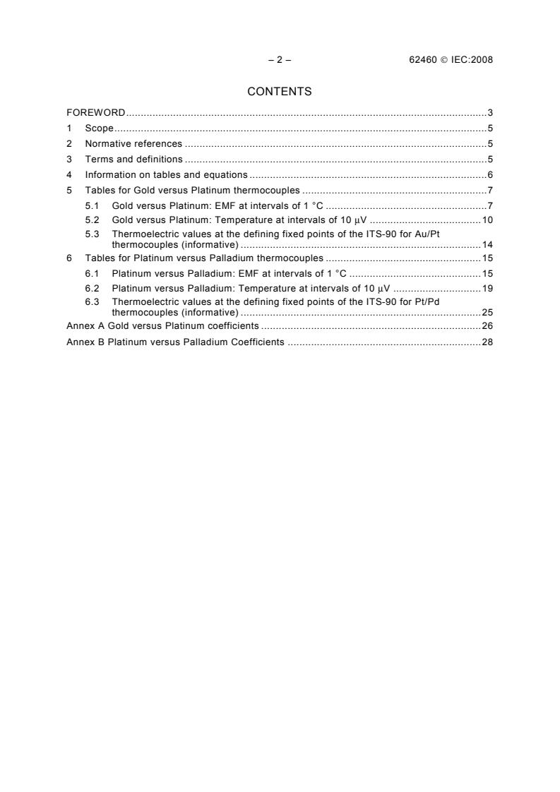 IEC 62460:2008 is a standard published by the International Electrotechnical Commission (IEC). Its full title is "Temperature - Electromotive force (EMF) tables for pure-element thermocouple combinations". This standard covers: IEC 62460:2008 specifies the equations and reference tables relating temperature to EMF (electro-motive force) for Gold versus Platinum and Platinum versus Palladium thermocouples. For information and convenience of use it also provides the approximate equations for temperature as functions of EMF.