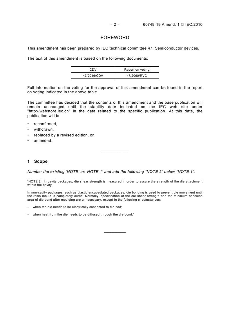 (Amendment)Amendment 1 - Semiconductor devices - Mechanical and climatic test methods - Part 19: Die shear strength