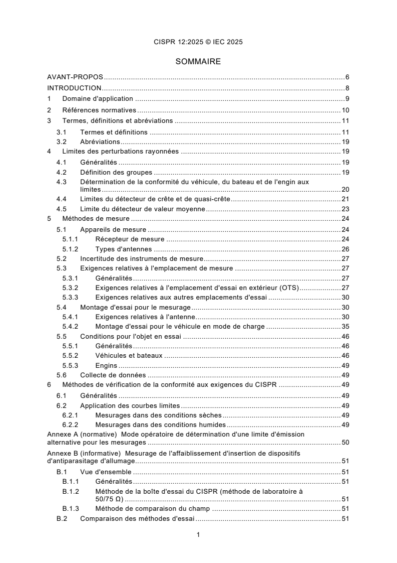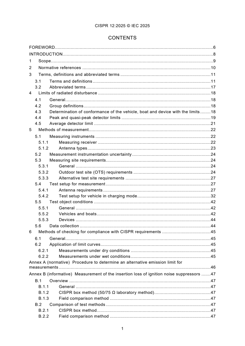 CISPR 12:2025 is a standard published by the International Electrotechnical Commission (IEC). Its full title is "Vehicles, boats and devices with internal combustion engines or traction batteries – Radio disturbance characteristics – Limits and methods of measurement for the protection of off-board receivers". This standard covers: CISPR 12:2025 The limits in this document are designed to provide protection in the frequency range of 30 MHz to 1 000 MHz for off-board receivers. Compliance with this document does not guarantee adequate protection for receivers nearer than 10 m to the vehicle, boat or device. This document applies to the emission of electromagnetic energy that can cause interference to radio reception and which is emitted from: 1) vehicles propelled by an internal combustion engine (ICE), electrical means or both (see 3.1.34); 2) boats propelled by an ICE, electrical means or both (see 3.1.4). Boats are tested in the same manner as vehicles except where they have unique characteristics as explicitly stated in this document; 3) devices equipped with ICE (see 3.1.9). In the case of hybrid devices (e.g. equipped with both ICE and traction batteries), only the ICE mode is included in this document; 4) inboard and outboard boat engines and motors [i.e. equipped with ICE, electric motor (EM), or both], when marketed independently. See Annex D for a flow chart and a list of examples to help determine the applicability of CISPR 12. This document does not apply to aircraft, household appliances, medical devices, traction systems (railway engine or locomotive, streetcar or tram and electric trolley bus), vehicle, boat and device off-board chargers or to incomplete vehicles, boats and devices. In the case of a dual-mode trolley bus (e.g. propelled by power from either AC/DC mains or an ICE), the ICE propulsion system is included, but the EM propulsion portion of the vehicle is excluded from this document. In addition, domestic helper robots, such as household cleaning robots, hotel service robots and personal safety robots are also excluded from the scope of this document. NOTE 1 Other than inboard or outboard boat engines and motors that are marketed independently, this document does not apply to components or incomplete products, such as an ICE, an incomplete vehicle or boat that has not yet been fitted with an ICE or EM, or spare parts. This document only applies to the final product, which is equipped with all applicable parts and components to be able to function as intended. NOTE 2 Appliances without ICE for typical housekeeping and service functions in the household and similar environment are covered by the requirements of CISPR 14-1[1]. NOTE 3 Protection of receivers used on board the same vehicle as the disturbance source(s) are covered by CISPR 25[2]. This document does not prescribe measurement methods or limits for conducted disturbances, for the charging mode of operation, where the (electric or hybrid) vehicle or boat is connected to power mains, either directly (i.e. plug-in vehicle or boat) or indirectly (i.e. wireless power charging). The user is referred to appropriate IEC and CISPR standards, which define measurement techniques and limits for this condition. NOTE 4 See IEC 61851-21-1[3] for road vehicles and IEC 61000-6-3[4], IEC 61000-6-4[5] and IEC 61000-6-8[6] for other types of vehicles or boats. The emission requirements in this document are not applicable to the intentional transmissions from a radio transmitter, as defined by the ITU-R, including its spurious emissions. Equipment that is covered by other CISPR product and product family emission standards are excluded from the scope of this document, except where they include ICE(s). In the latter case, the equipment complies with this document in all modes of operation where the ICE(s) is(are) active. NOTE 5 The other CISPR product or product family emission standard can also apply to the equipment for those modes of operation where the ICE(s) is (are) not active. In case the ICE(s) is (are) always in operation, the other CISPR product or product family emission standard can still apply, for verifying the emissions from the other components and circuitry of the equipment. Annex B and Annex C contain methods to evaluate the disturbance characteristics of high