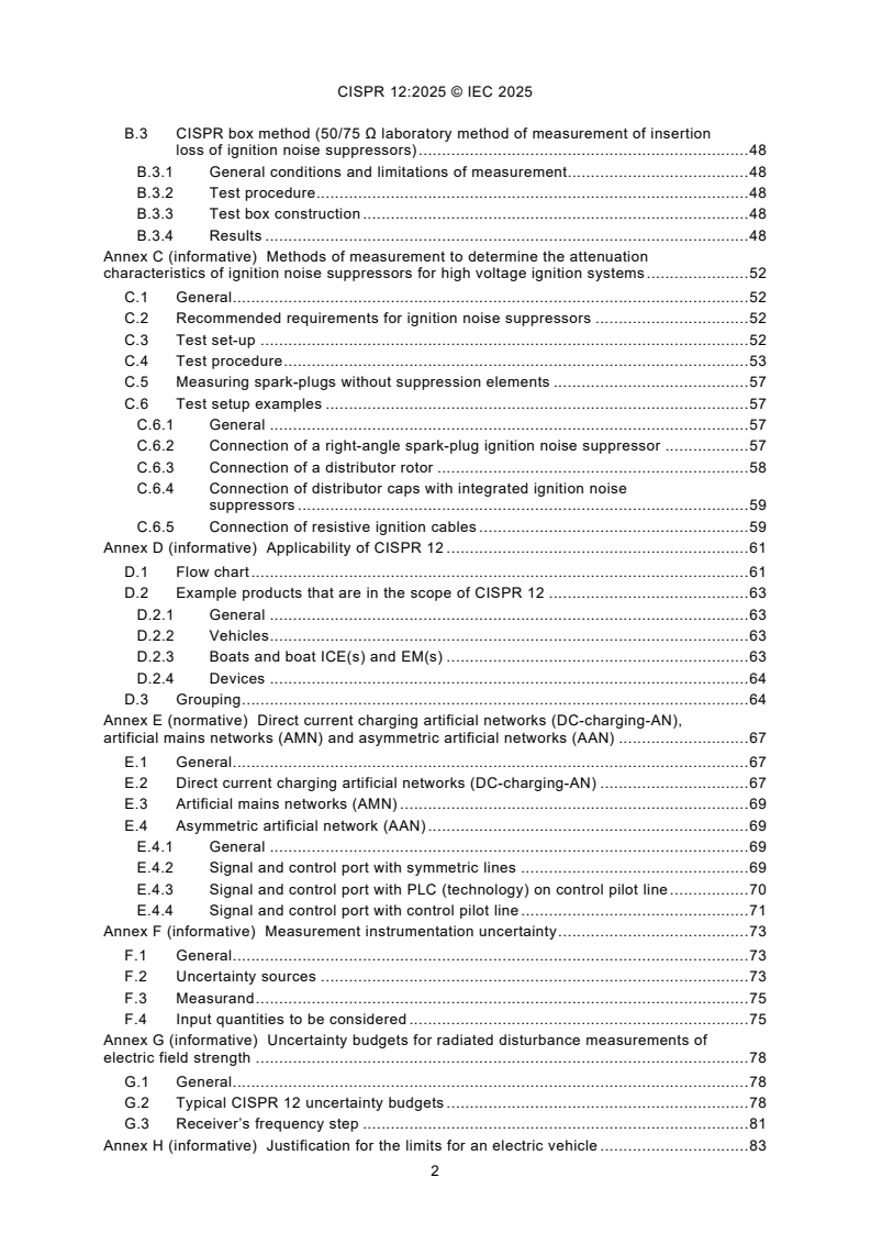 - Supportive annexes: Annexes include procedures for ignition noise suppressor evaluation (B, C), applicability guidance and examples (D), artificial networks for charging tests (E), measurement uncertainty and uncertainty budgets (F, G), and rationale for EV limits (H).