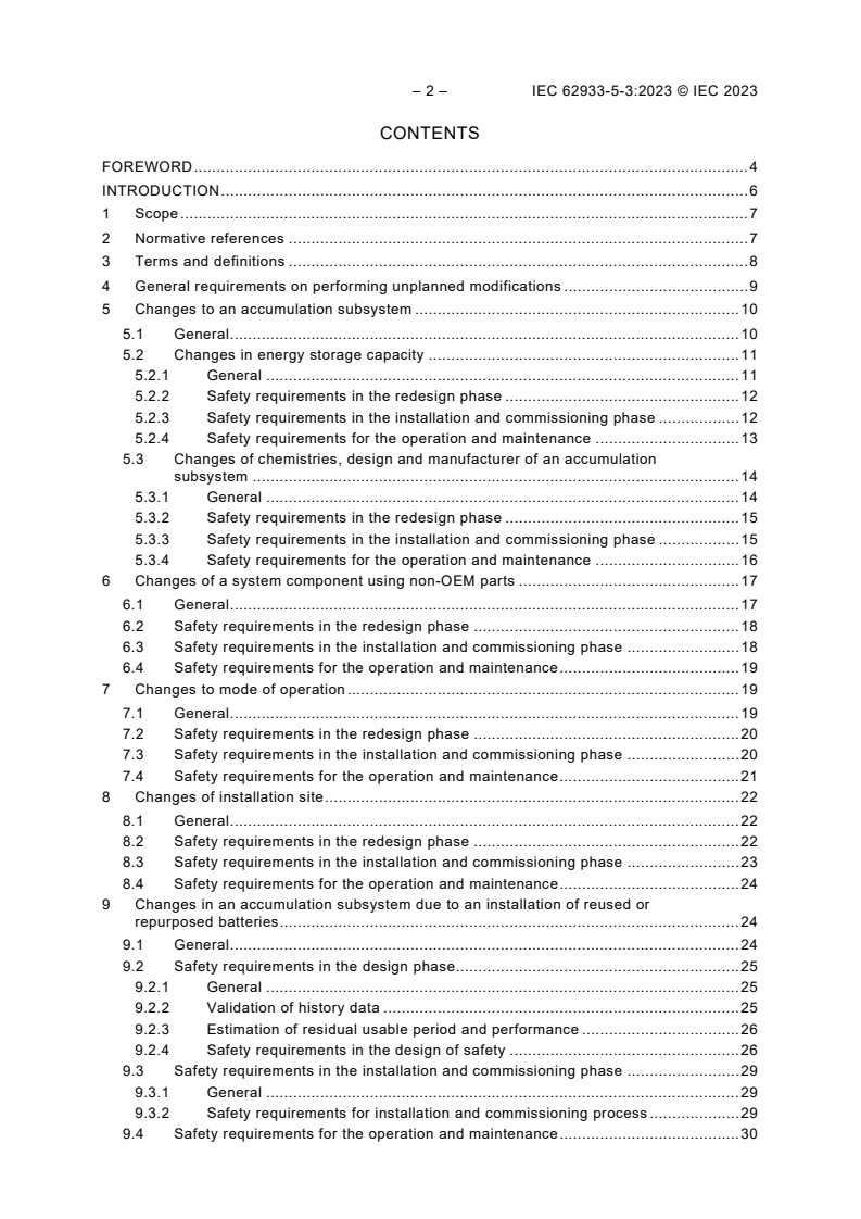 Unplanned modifications may include changes to energy storage capacity, battery chemistries, subsystem designs, installation locations, and the integration of reused or repurposed batteries. The standard complements IEC 62933-5-2, which covers overall safety aspects of BESS, by prescribing additional safety protocols necessary for modifications beyond the original design scope.