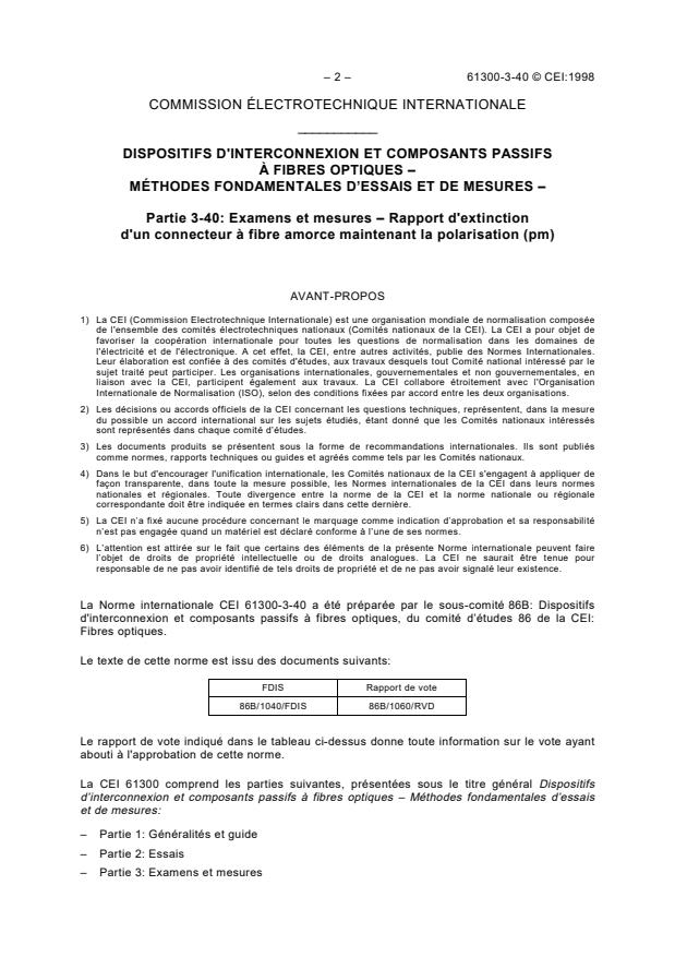 IEC 61300-3-40:1998 a pour objet de mesurer la capacité d'un connecteur pour fibres optiques à maintenir un rapport d'extinction donné transversalement à la connexion dans une fibre pm. Dans cet essai, la mesure est limitée au cas le plus courant, celui d'une lumière polarisée pratiquement de façon linéaire se propageant dans une fibre pm. Le terme "rapport d’extinction" utilisé ici se réfère à la proportion de lumière se propageant dans les deux axes de polarisation orthogonaux de la fibre et est plus exactement défini comme "diaphonie causée par la polarisation". "Rapport d’extinction" est le terme usuel. Cette procédure a été établie pour utilisation avec un équipement dédié à un environnement manufacturier et incorpore conséquemment une configuration pour le test plutôt élaborée. Veuillez noter que d’autre configurations plus directes peuvent aussi être utilisées dans des laboratoires d’optique ayant l'équipement approprié. Celles-ci pourront être le sujet de procédures de test additionnelles dans le futur. Il faut aussi souligner que cette procédure de test n’est pas appropriée pour des tests continus de longue durée; une variation de l’alignement de la polarisation peut avoir lieu particulièrement dans la fibre monomode et conséquemment des mesures répétées plutôt que continues sont requises pour le test à long terme de composantes.