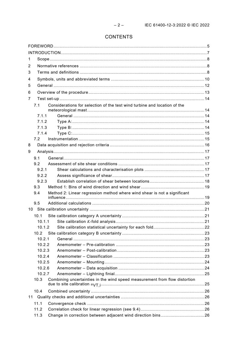 IEC 61400-12-3:2022 specifies a measurement and analysis procedure for deriving the wind speed correction due to terrain effects and applies to the performance testing of wind turbines of all types and sizes connected to the electrical power network as described in IEC 61400‑12‑1. The procedure applies to the performance evaluation of specific wind turbines at specific locations. The purpose of this part of IEC 61400 is to provide a uniform methodology that will ensure consistency, accuracy and reproducibility in the measurement and analysis of a site calibration for use in the determination of the power performance of wind turbines. This document provides guidance in the measurement, analysis, and reporting of the site calibration for subsequent use in power performance testing for wind turbines.