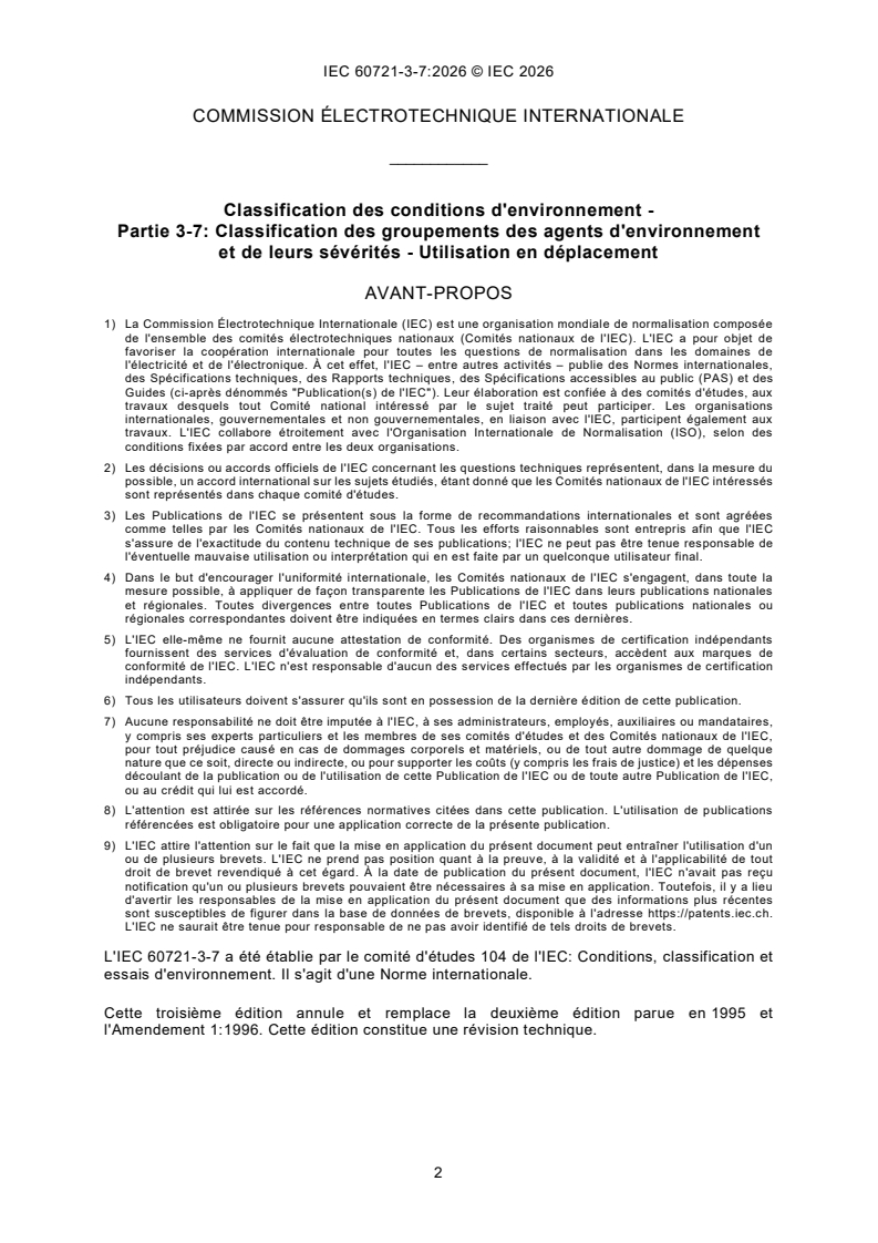 IEC 60721-3-7:2026 - Classification des conditions d'environnement - Partie 3-7: Classification des groupements des agents d'environnement et de leurs sévérités - Utilisation en déplacement/6/2026