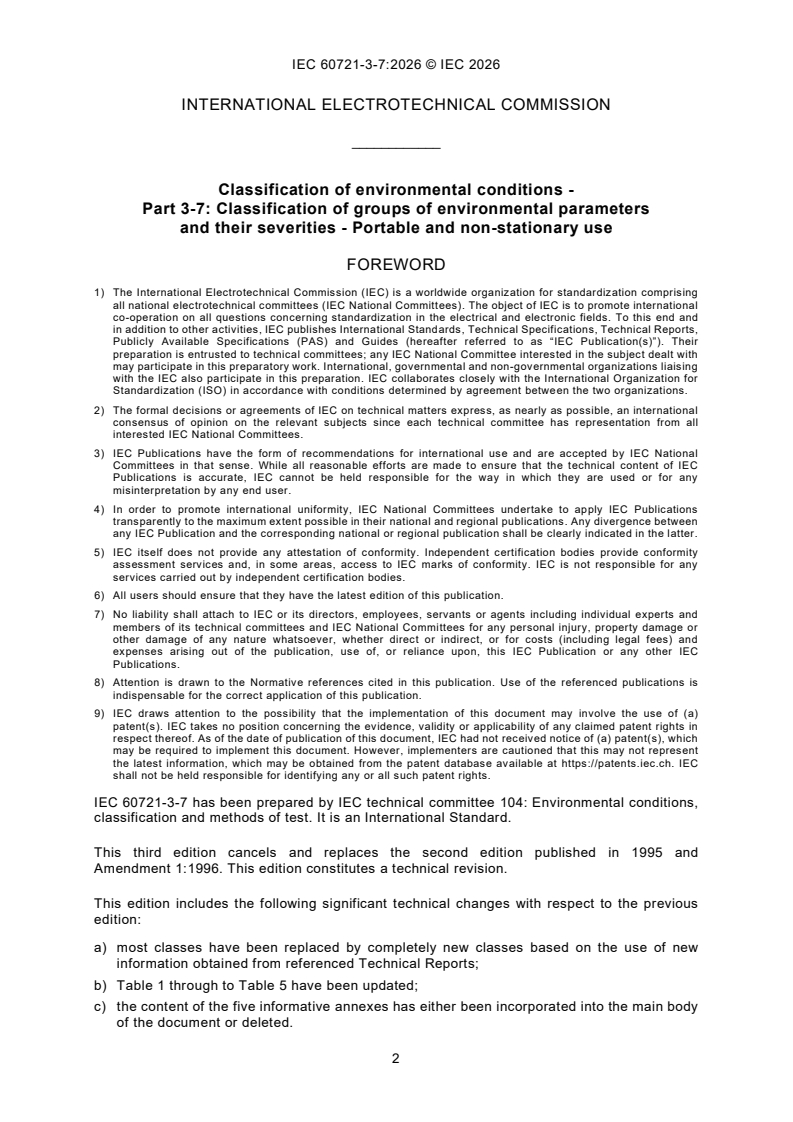IEC 60721-3-7:2026 - Classification of environmental conditions - Part 3-7: Classification of groups of environmental parameters and their severities - Portable and non-stationary use/6/2026