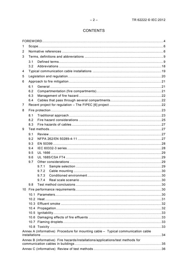 IEC TR 62222:2012 is a technical report published by the International Electrotechnical Commission (IEC). Its full title is "Fire performance of communication cables installed in buildings". This standard covers: IEC/TR 62222:2012 provides recommendations for the requirements and test methods to be specified for the fire performance of communication cables when installed in buildings. The recommendations relate to typical applications and installation practices for copper and optical cables in buildings. This TechnicalReport includes an assessment of the fire hazards presented by such installations, and describes fire scenarios that have been established and the appropriate cable fire performances to mitigate these hazards. ISO/IEC 14763-2 recommends installation methods which,together with this Technical Report, provide guidelines for improving safety during fire. The recommendations also take into account legislation and regulation applicable to the fire performance of cables, an assessment of known test methods and their ability to measure the recommended fire performance. Power cables are usually segregated from communication cables for electrical safety and installed differently so they have not been addressed in this Technical Report.
