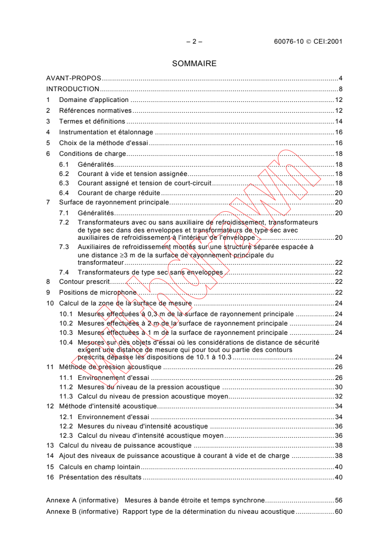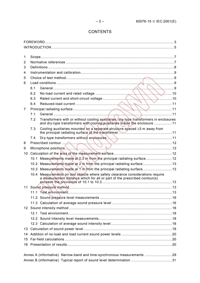 IEC 60076-10:2001 is a standard published by the International Electrotechnical Commission (IEC). Its full title is "Power transformers - Part 10: Determination of sound levels". This standard covers: Defines sound pressure and sound intensity measurement methods by which sound power levels of transformers, reactors and their associated cooling auxiliaries may be determined. Is applicable to transformers and reactors covered by the IEC 60076 series, IEC 60289, and the IEC 61378 series, without limitation as regards size or voltage and when fitted with their normal cooling auxiliaries.