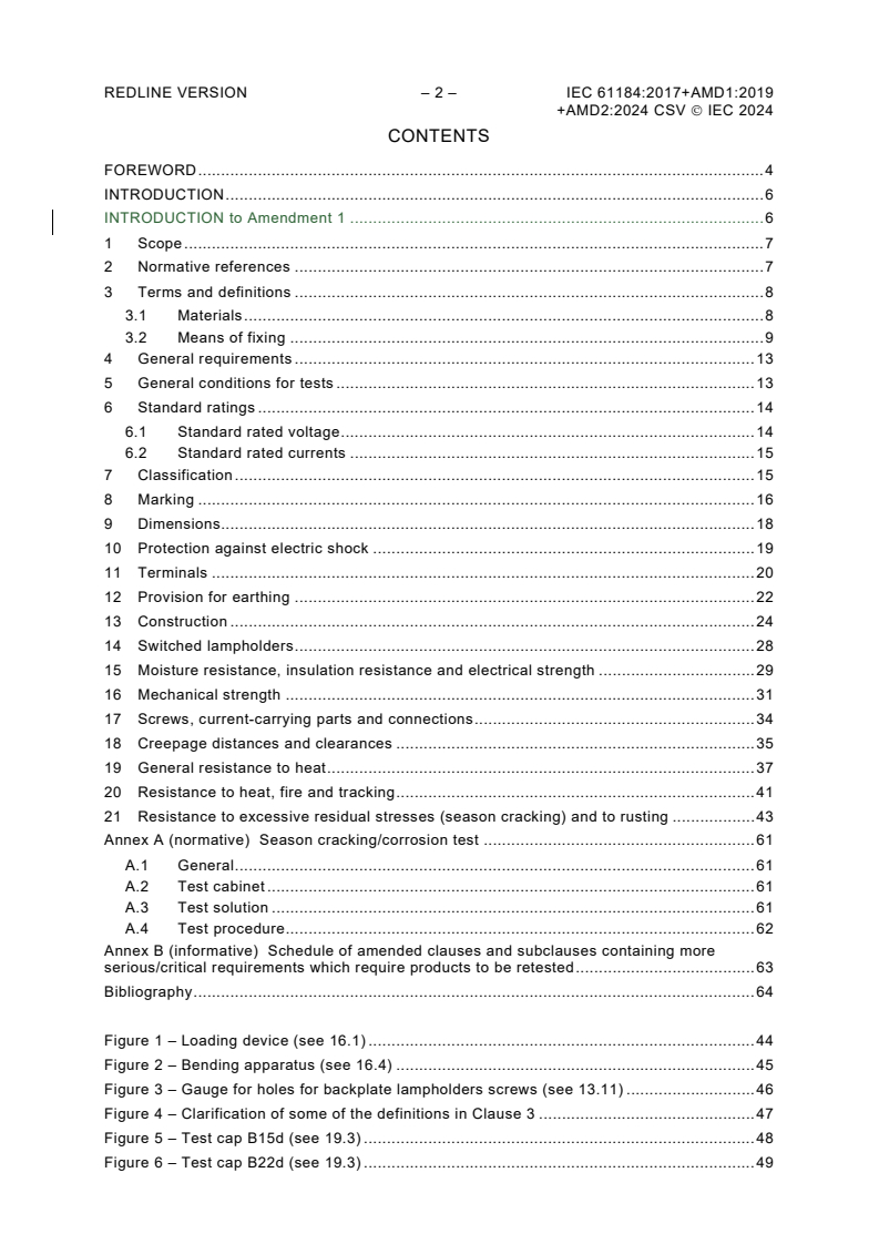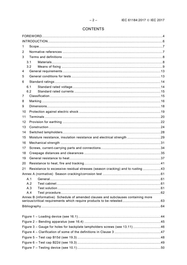 IEC 61184:2017 This document applies to bayonet lampholders B15d and B22d for connection of lamps and semi-luminaires to a supply voltage of 250 V. This document also covers lampholders which are integral with a luminaire or intended to be built into appliances. It covers the requirements for the lampholder only. This fourth edition cancels and replaces the third edition published in 2008 and Amendment 1:2011. This edition constitutes a technical revision. This edition includes the following significant technical changes with respect to the previous edition: a) Restructuring of the standard in accordance with IEC Directives Part 2. b) Clause 18: Update on creepage distances and clearances; c) Addition of Annex B.