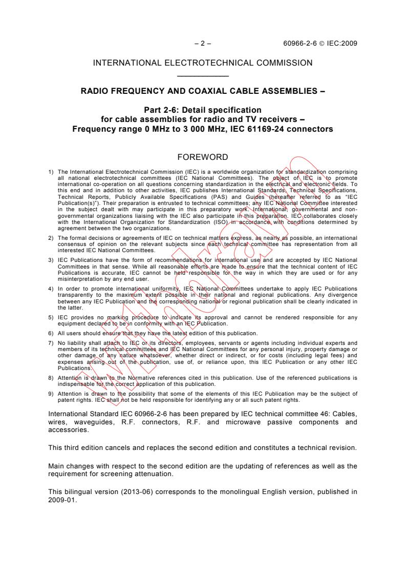 IEC 60966-2-6:2009 is an international standard developed by the International Electrotechnical Commission (IEC) that specifies requirements for radio frequency and coaxial cable assemblies used in radio and TV receivers. This standard focuses specifically on flexible coaxial cable assemblies within the frequency range of 0 MHz to 3,000 MHz and utilizes IEC 61169-24 connectors (subfamily F). It forms part of the broader IEC 60966 series addressing coaxial cable assemblies and complements other related standards such as IEC 60966-1:1999, IEC 60966-2-1:2008, and IEC 60966-2-2:2003.