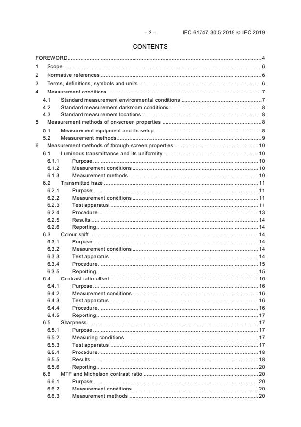 IEC 61747-30-5:2019 is a standard published by the International Electrotechnical Commission (IEC). Its full title is "Liquid crystal display devices - Part 30-5: Optical measuring methods of transmissive transparent LCD modules". This standard covers: IEC 61747-30-5:2019(E) specifies the standard measurement conditions and measuring methods for determining the optical properties of transparent liquid crystal display modules which operate in a transmissive mode. More specifically, this document focuses on three particular aspects of the transparent properties, i.e. transmittance, haze, and image distortion.