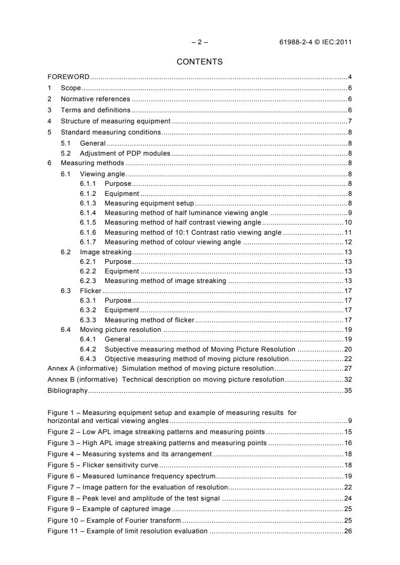 IEC 61988-2-4:2011 determines the measuring methods for characterizing the performance of plasma display panel (PDP) modules in the following areas: a) viewing angle; b) image streaking; c) flicker; d) moving picture resolution.