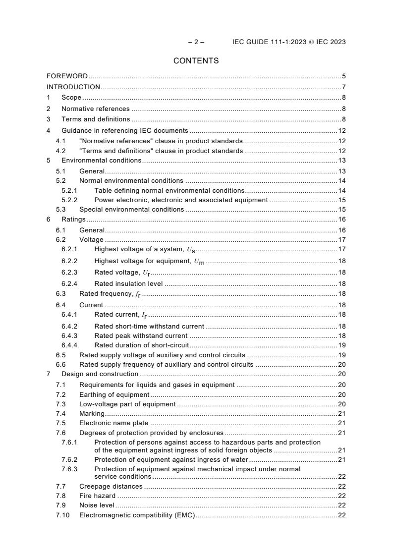 IEC GUIDE 111-1:2023 is a guide published by the International Electrotechnical Commission (IEC). Its full title is "Electric equipment for high-voltage substations - Common recommendations for product and system standards - Part 1: AC (alternating current)". This standard covers: IEC Guide 111-1:2023 is a horizontal publication which gives guidance for the harmonization of product and system standards for HV substations (higher than 1 kV). It addresses AC equipment which is found in high-voltage (HV) substations in most cases. This document contains recommendations for common specifications for all HV substation product and system standards, each of which is augmented by the technical background specific to each technical committee, which naturally retains freedom in its technical choices. This document is applicable when developing product and systems standards for HV power electronic equipment for the AC part of the substation. This first edition of IEC Guide 111-1, together with IEC Guide 111-2, cancels and replaces the second edition of IEC Guide 111 published in 2004. The main changes with respect to the previous edition are as follows: IEC Guide 111 is revised into two parts – Part 1 for AC and Part 2 for DC (Part 2 to be prepared); the scope of the document has been expanded to cover electric equipment in AC high-voltage substations; new definitions have been included; normal conditions have been revised; a general revision of other clauses.