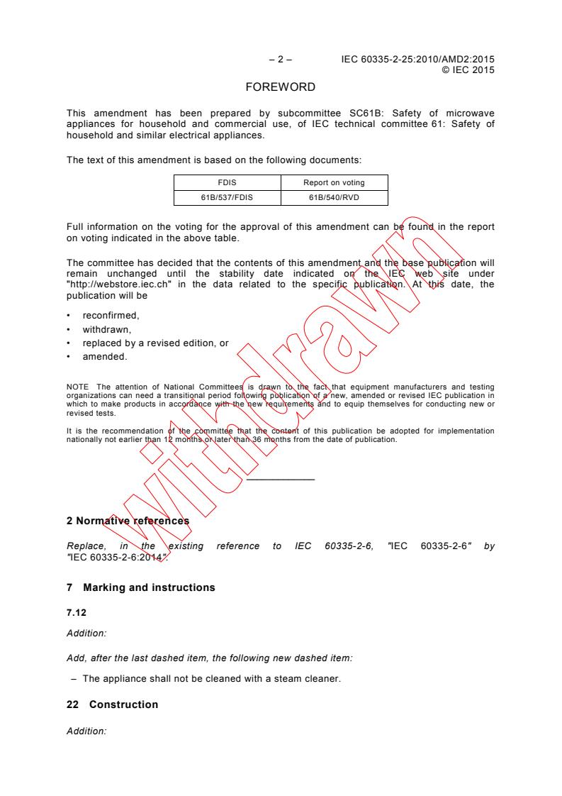 Scope of Amendment 2: This amendment supplements the base IEC 60335-2-25 standard by specifying new requirements for the construction, safety testing, and marking instructions of microwave ovens.