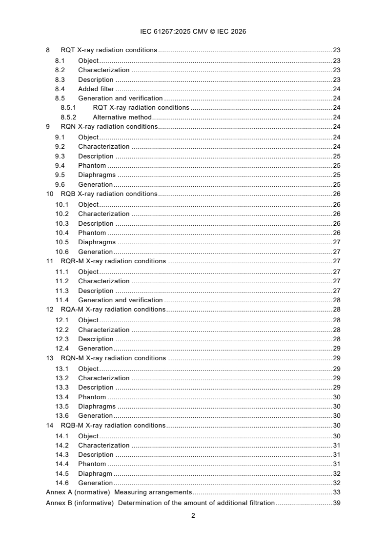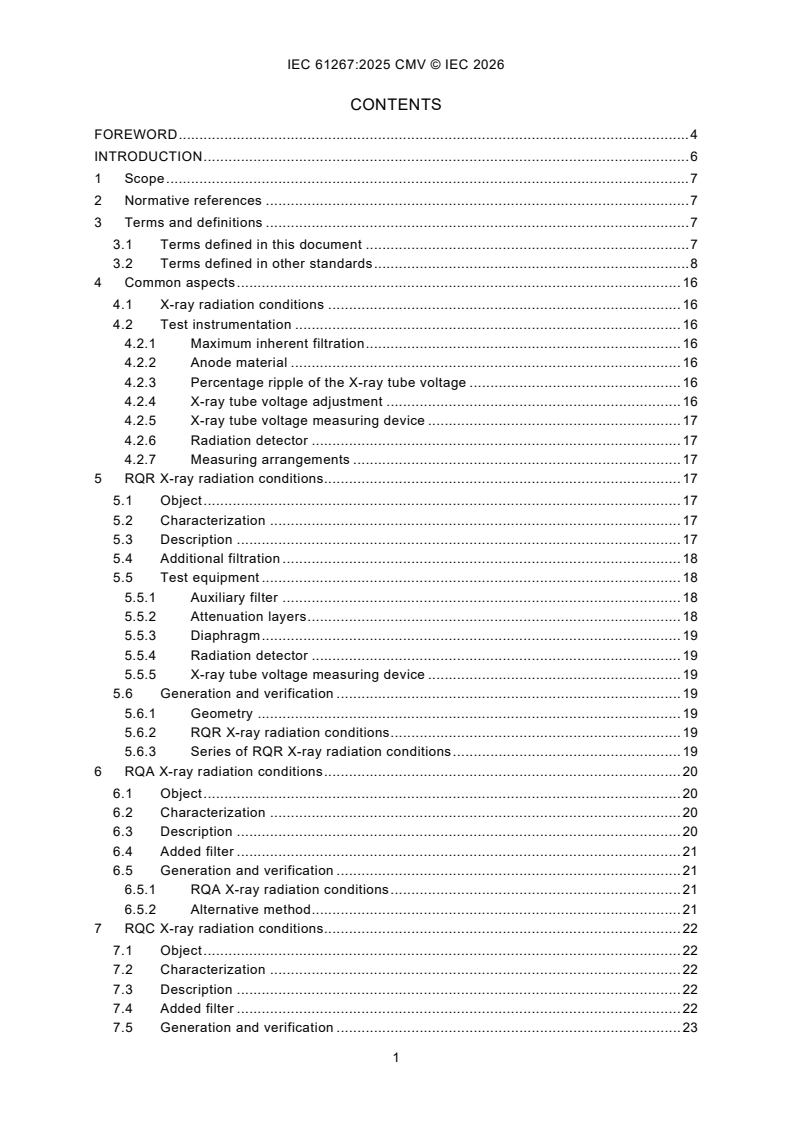 IEC 61267:2025 is a standard published by the International Electrotechnical Commission (IEC). Its full title is "Medical diagnostic X-ray equipment - Radiation conditions for use in the determination of characteristics". This standard covers: IEC 61267:2025 applies to test procedures which, for the determination of characteristics of systems or components of medical diagnostic X-ray equipment, require well-defined X-ray radiation conditions. This document deals with methods for generating X-ray radiation conditions which can be used under test conditions typically found in test laboratories or in manufacturing facilities for the determination of characteristics of medical diagnostic X-ray equipment. IEC 61267:2025 cancels and replaces the second edition published 2005. This edition constitutes a technical revision. This edition includes the following significant technical changes with respect to the previous edition: a) removing former Annex C “Measurement of the practical peak voltage”; b) inserting informative “Tabulated values for the squared signal-to-noise ratio per air kerma (SNR2in)” and normative “Additional X-ray radiation conditions as used in mammography and determination of the corresponding nominal aluminium half-value layers”; c) revision of X-ray radiation conditions; d) new method for verification of X-ray radiation conditions; e) change of term definitions.