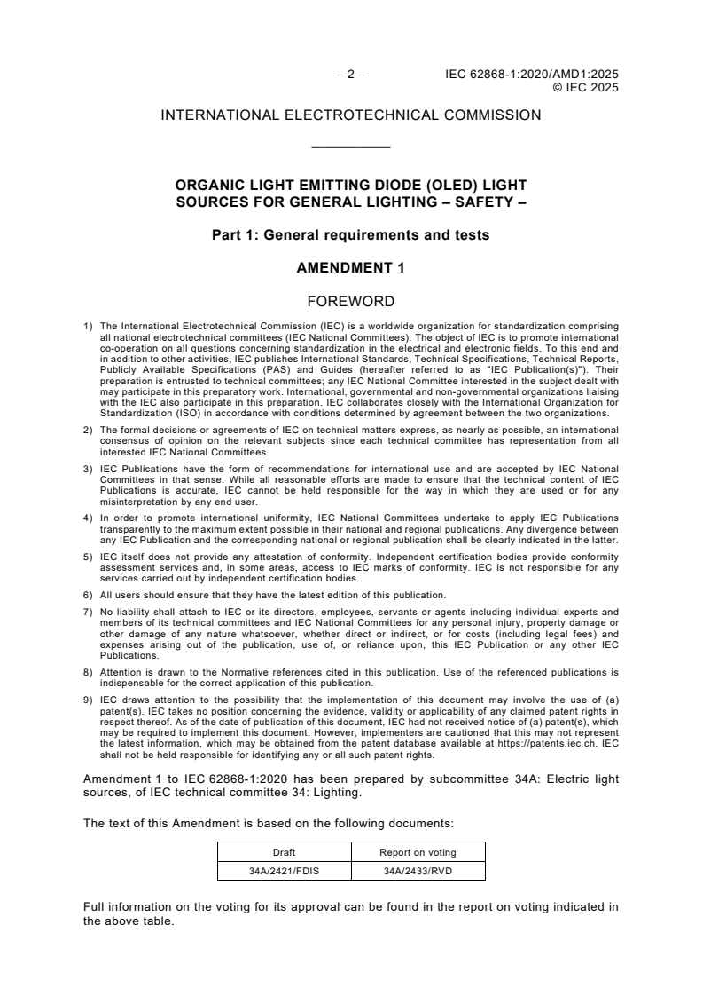 IEC 62868-1:2020/AMD1:2025 is a standard published by the International Electrotechnical Commission (IEC). Its full title is "Amendment 1 - Organic light emitting diode (OLED) Light sources for general lighting - Safety - Part 1: General requirements and tests". This standard covers: Amendment 1 - Organic light emitting diode (OLED) Light sources for general lighting - Safety - Part 1: General requirements and tests